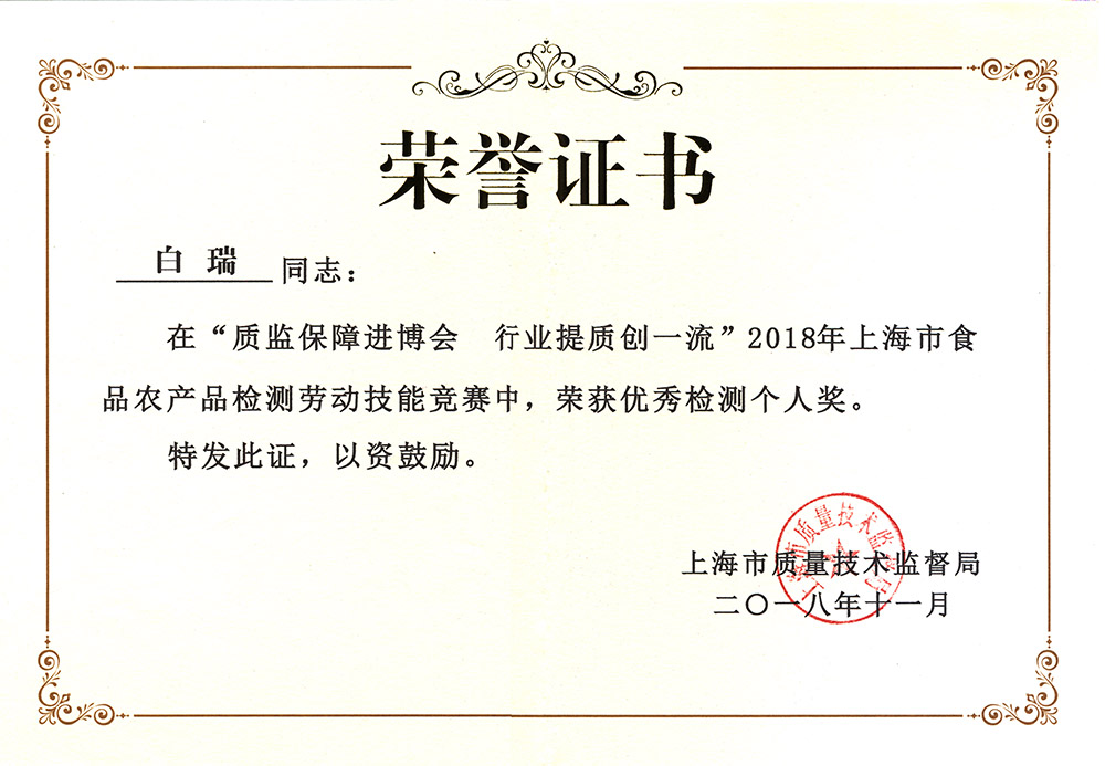 2018.11 2018年上海市食品農產品檢測勞動技能競賽優秀檢測個人獎 |